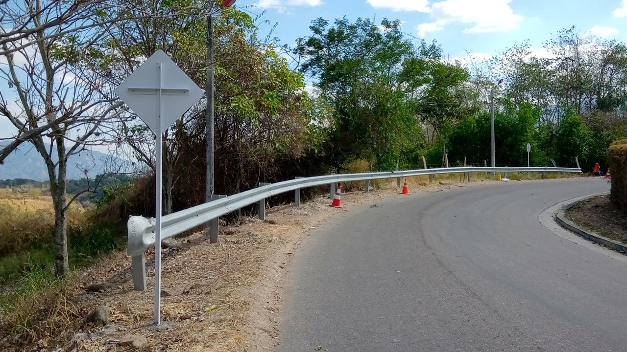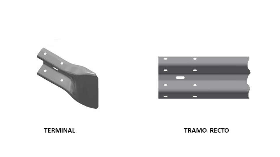 Tramo recto: tramo galvanizado de 4.13 m 3.81 m-útil , en lámina de alta resistencia, 345 mpa de minimo punto de fluencia, galvanizado por inmersión en caliente, con un espesor final de 2,7 – 0,23 mm, peso por pieza de 43.5 kg